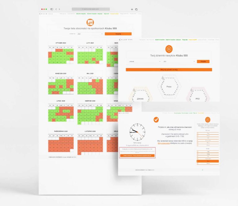 Z Klubem 555 współpracujemy od chwili jego powstania. Początkowo stworzyliśmy na potrzeby klubu prosty formularz rejestracyjny połączony z możliwością odznaczania swojej obecności podczas codziennych, porannych spotkań online Klubu. W pierwotnym zamierzeniu system miał służyć wyłącznie do odznaczania swojej obecności. Uczestnik spotkania miał się zalogować do panelu i wówczas następowało automatyczne oznaczenie jego obecności.